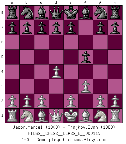 Last move : 1-0 2010 September 24 21:5:9 [Event "FICGS__CHESS__CLASS_B__000119"] [Site "FICGS"] [Date "2010.08.13"] [Round "1"] [White "Jacon,Marcel"] [Black "Trajkov,Ivan"] [Result "1-0"] [WhiteElo "1800"] [BlackElo "1883"] 1.d4 f5 2.f3 1-0 This chess game has been lost on time (started : 2010.08.13 4:39:47) Dutch Player White won this chess game. Follow this game move after move (download)There is only one thing Fischer does in Chess without pleasure: to lose ! (Boris Spassky) Jeder weiß, dass Gasprom Putins persönliches Machtinstrument ist. Die Firma wird vom Kreml aus geleitet und wird schon deshalb nie transparent sein. (Garry Kasparov) El Ajedrez es un mar en el cual un mosquito puede beber y un elefante puede bañarse. (Refrán Hindú) Ne tendez aucun piège pour le plaisir ! Ne jouez rien dans l'espoir que l'adversaire réagisse de façon stupide ! Prenez toujours pour acquis que l'adversaire va trouver le meilleur coup ! Ne jouez jamais de coup dans l'espoir que l'adversaire ne voie pas la menace ! Chacun de vos coups doit améliorer la position d'une façon ou d'une autre. A good programmer is someone who always looks both ways before crossing a one-way street. (Doug Linder)