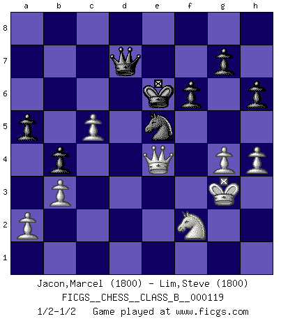 Last move : 1/2-1/2 2010 September 10 15:30:36 [Event "FICGS__CHESS__CLASS_B__000119"] [Site "FICGS"] [Date "2010.08.13"] [Round "1"] [White "Jacon,Marcel"] [Black "Lim,Steve"] [Result "1/2-1/2"] [WhiteElo "1800"] [BlackElo "1800"] 1.e4 c5 2.Nf3 d6 3.e5 Nc6 4.Bb5 Bd7 5.Nc3 e6 6.exd6 Bxd6 7.d4 cxd4 8.Nxd4 Qc7 9.Bxc6 Bxc6 10.Qe2 a6 11.Nxc6 Qxc6 12.O-O Ne7 13.Rd1 Rd8 14.Bg5 f6 15.Bh4 e5 16.Ne4 O-O 17.f3 Bc7 18.c4 Bb6+ 19.Bf2 Bxf2+ 20.Nxf2 Nf5 21.Qe4 Qc8 22.Rxd8 Rxd8 23.Rd1 Nd4 24.b3 Qd7 25.Kh1 Qc7 26.f4 Nc6 27.Rxd8+ Qxd8 28.g3 exf4 29.Qxf4 Qd7 30.Kg2 Ne5 31.Qe4 h6 32.g4 Kf7 33.Kg3 b5 34.c5 a5 35.h3 b4 36.h4 Ke6 37.Nh3 Ke7 38.Nf2 Ke6 39.Nh3 Ke7 40.Nf2 Ke6 1/2-1/2 Sicilian Kingside Castling by player White (move 12) Kingside Castling by player Black (move 16) This chess game ended in a draw. Follow this game move after move (download)If a ruler does not understand Chess, how can he rule over a kingdom ? (King Khusros II) Wie kann ich Remis annehmen? Ich weiß ja gar nicht, wie ich stehe! (Fritz Sämisch) No soy una persona materialista y por eso, no resiento la falta o pérdida del dinero. La ausencia de cosas mundanas carece de importancia. Ya que el Ajedrez es una forma en la que puedo ser tan materialista como yo desee sin tener la necesidad de vender mi alma. (Jamie Walter Adams) Le temps de noter son nom sur la feuille de partie, j'étais déjà en zeitnot ! D'un modeste amateur apparié lors de la première ronde d'un open contre le grand-maître Azmaïparashvili. In God we trust, all others we virus scan. (Anonymous)