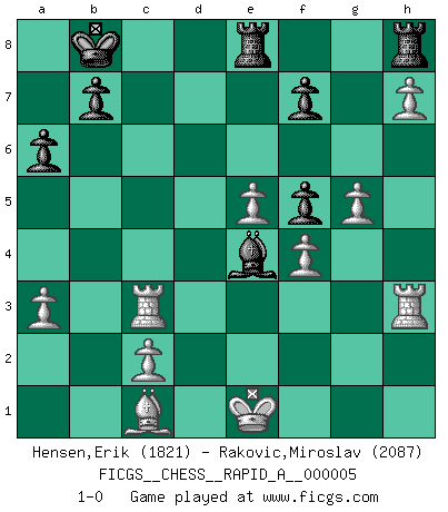Last move : 1-0 2007 January 17 12:30:52 [Event "FICGS__CHESS__RAPID_A__000005"] [Site "FICGS"] [Date "2006.11.16"] [Round "1"] [White "Hensen,Erik"] [Black "Rakovic,Miroslav"] [Result "1-0"] [WhiteElo "1821"] [BlackElo "2087"] 1.e4 e6 2.d4 d5 3.Nc3 Bb4 4.e5 c5 5.a3 Bxc3+ 6.bxc3 Ne7 7.Qg4 Qc7 8.Qxg7 Rg8 9.Qxh7 cxd4 10.Ne2 Nbc6 11.f4 Bd7 12.Qd3 dxc3 13.Nxc3 a6 14.Rb1 Na5 15.h4 Nf5 16.Rh3 Qc5 17.h5 O-O-O 18.Qe2 Nc4 19.g4 Nh6 20.g5 Nf5 21.Qf2 Qa5 22.h6 Bc6 23.Rb3 Rh8 24.Bd3 Kb8 25.h7 d4 26.Bxc4 dxc3 27.Bd3 Nd4 28.Rb4 Nf5 29.Bxf5 exf5 30.Rd4 Rde8 31.Rc4 Bd5 32.Qc5 Qxc5 33.Rxc5 Be4 34.R5xc3 1-0 French : Winawer, Advance, poisoned pawn variation Queenside Castling by player Black (move 17) Player White won this chess game. Follow this game move after move (download)Via the squares on the chessboard, the Indians explain the movement of time and the age, the higher influences which control the world and the ties which link Chess with the human soul. (Al-Masudi) Kombinieren und Schwarzhandel gehören verboten. (Savielly Grigorievitsch Tartakower) Si tu oponente no puede hacer nada activo, entonces no apures la posición; En vez de eso, dejalo estar sentado ahí, sufriendo y rogandote por un empate. (Jeremy Silman) Dieu déplace le joueur, et celui-ci la pièce. Quel Dieu derrière Dieu commence donc la trame ? Arturo Perez-Reverte (prix de littérature policière 1993). Perhaps chess is the wrong game for the times (The Chess Master and the Computer, by Garry Kasparov - 2010)
