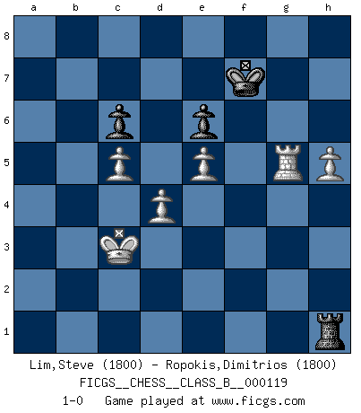 Last move : 1-0 2010 October 2 11:27:38 [Event "FICGS__CHESS__CLASS_B__000119"] [Site "FICGS"] [Date "2010.08.13"] [Round "1"] [White "Lim,Steve"] [Black "Ropokis,Dimitrios"] [Result "1-0"] [WhiteElo "1800"] [BlackElo "1800"] 1.d4 d5 2.c4 c6 3.Nf3 Nf6 4.Nc3 dxc4 5.a4 Bf5 6.e3 Nbd7 7.Bxc4 e6 8.O-O Be7 9.Re1 Bb4 10.e4 Bxc3 11.bxc3 Nxe4 12.Ba3 Qa5 13.Bb4 Qc7 14.Qc2 Qf4 15.Bd3 Nd6 16.a5 Bxd3 17.Qxd3 O-O-O 18.c4 Nf5 19.g3 Qg4 20.a6 b6 21.c5 b5 22.Ba5 Ne7 23.Bxd8 Rxd8 24.Kg2 h6 25.Ra3 Qf5 26.Qd2 Qd5 27.Kg1 g5 28.h3 Ng6 29.Rc3 Kb8 30.Rd1 Nf6 31.Rd3 Ne4 32.Qe2 Kc7 33.Ne1 f5 34.Nc2 Qa2 35.Re3 Ne7 36.f3 Nd5 37.Ra3 Ndc3 38.Qd3 Qb2 39.fxe4 Nxd1 40.Qxd1 b4 41.Re3 f4 42.Rd3 fxg3 43.Rxg3 b3 44.Na1 Rf8 45.Rxb3 Qf2+ 46.Kh1 Qf1+ 47.Qxf1 Rxf1+ 48.Kg2 Rxa1 49.Rb7+ Kd8 50.Rxa7 h5 51.Kf3 Ra3+ 52.Ke2 Ra2+ 53.Kd3 Ra4 54.e5 g4 55.h4 g3 56.Ke4 g2 57.Rg7 Ra2 58.a7 Rxa7 59.Rg8+ Ke7 60.Rxg2 Kf7 61.Rg5 Ra1 62.Rxh5 Kg7 63.Rg5+ Kf7 64.h5 Re1+ 65.Kd3 Rh1 66.Kc3 1-0 QGD Slav : Dutch variation Kingside Castling by player White (move 8) Queenside Castling by player Black (move 17) 10 pieces endgame at move 62 : White KRPPPP , Black KRPP WHITE : King + 1 Rook 4 Pawns BLACK : King + 1 Rook 2 Pawns Player White won this chess game. Follow this game move after move (download)Up to this point White has been following well-known analysis. But now he makes a fatal error: he begins to use his own head. (Siegbert Tarrasch) Jeder Fehler erscheint unglaublich dumm, wenn andre ihn begehen. (Georg Christoph Lichtenberg) El Ajedrez es tan inspirador que yo no creo que un buen jugador sea capaz de tener un pensamiento malo durante una partida. (Wilhelm Steinitz) Votre prénom est 'Tactique', votre deuxième prénom est 'Tactique' et votre nom est 'Tactique'. (Ken Smith) Ah, the Socrating method. The best way we have of teaching everything-apart from juggling chainsaws. (Gregory House, House M.D.)