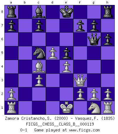 Last move : 0-1 2011 January 1 23:8:9 [Event "FICGS__CHESS__CLASS_B__000119"] [Site "FICGS"] [Date "2010.08.13"] [Round "1"] [White "Zamora Cristancho,Sammy"] [Black "Vasquez,Fernando"] [Result "0-1"] [WhiteElo "2000"] [BlackElo "1835"] 1.d4 d5 2.c4 dxc4 3.Nc3 Nf6 4.e4 e5 5.d5 b5 6.Bg5 h6 7.Bxf6 Qxf6 8.Nxb5 Bb4+ 9.Nc3 Nd7 10.Bxc4 Qg6 11.Qf3 Bxc3+ 12.bxc3 Nc5 0-1 This chess game has been lost on time (started : 2010.08.13 4:39:47) Queen's gambit accepted Player Black won this chess game. Follow this game move after move (download)Before the endgame, the Gods have placed the middle game. (Siegbert Tarrasch) Alle offensichtlichen Züge sehen nach dem Spiel in der Analyse verdächtig aus. (Viktor Kortschnoi) Estaba muy claro de que el punto vulnerable del Gran Maestro Americano (Bobby Fischer) radicaba en las posiciones de doble filo, colgantes, irracionales, donde el siempre falló en encontrar un triunfo aún en una posición de clara victoria. (Efim Geller) A ce moment-là, je menaçais de comprendre la position ! (Clément L'Heureux) Whatever you do, don't be bored. This is absolutely the most exciting time we could have possibly hoped to be alive. And things are just starting. (From movie Waking life)