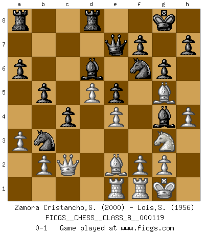 Last move : 0-1 2010 December 27 22:55:25 [Event "FICGS__CHESS__CLASS_B__000119"] [Site "FICGS"] [Date "2010.08.13"] [Round "1"] [White "Zamora Cristancho,Sammy"] [Black "Lois,Spyros"] [Result "0-1"] [WhiteElo "2000"] [BlackElo "1956"] 1.d4 d5 2.c4 e6 3.Nc3 Nf6 4.e3 c6 5.Nf3 Nbd7 6.Be2 Bd6 7.O-O O-O 8.Qc2 dxc4 9.Bxc4 b5 10.Bd3 Bb7 11.a3 Qe7 12.e4 e5 13.Ne2 Rfd8 14.Ng3 g6 15.Bg5 a6 16.Rae1 c5 17.d5 c4 18.Be2 Nc5 19.h4 Nb3 20.Nh2 Bc8 21.Ng4 Bxg4 0-1 This chess game has been lost on time (started : 2010.08.13 4:39:47) QGD : 3...Nf6 Kingside Castling by player White (move 7) Kingside Castling by player Black (move 7) Player Black won this chess game. Follow this game move after move (download)Chess mastery essentially consists of analyzing Chess positions accurately. (Mikhail Botvinnik) Ich war zu klein für die Schach-Schülermannschaft! (Woody Allen) El Ajedrez es el juego mas altamente simbólico, pero las agresiones estan por lo tanto aún mas francamente representadas en la partida. Tal vez comenzo como un juego de guerra; Algo como la representación de una batalla en miniatura entre las fuerzas de dos reinos. (Karl Meninger) La guerre est enfant de la passion, la passion est enfant du narcissisme et le narcissisme est l'enfant. (...) Une autre partie ? (Thibault de Vassal) The large trees attract high winds. (Chinese proverb)