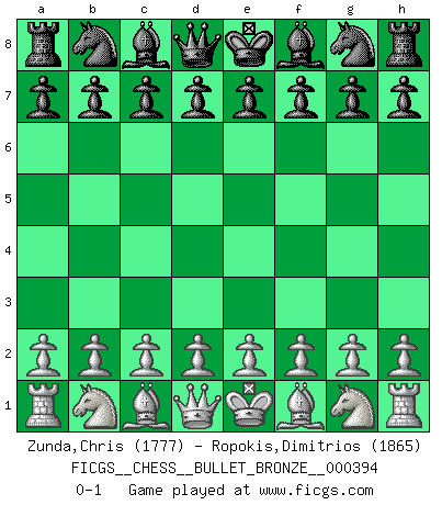 Last move : 0-1 2010 August 13 22:38:44 [Event "FICGS__CHESS__BULLET_BRONZE__000394"] [Site "FICGS"] [Date "2010.08.13"] [Round "1"] [White "Zunda,Chris"] [Black "Ropokis,Dimitrios"] [Result "0-1"] [WhiteElo "1777"] [BlackElo "1865"] 0-1 This chess game has been lost on time (started : 2010.08.13 11:18:54) Player Black won this chess game. Follow this game move after move (download)My God, Bobby Fischer plays so simply. (Alexei Suetin) Auf jeden Fall musst du zuerst Rechtsanwalt werden, damit du deine eigenen Interessen und die deiner Familie vertreten kannst. [Brief an seinen Sohn] (José Raúl Capablanca) Si no le temes a Spassky, entonces elimino el elemento del dinero. (Jim Slater) Donnez-moi un Cavalier en 6e et je gagnerais toutes mes parties. (Steinitz) Men never do evil so completely and cheerfully as when they do it from religious conviction. (Blaise Pascal)
