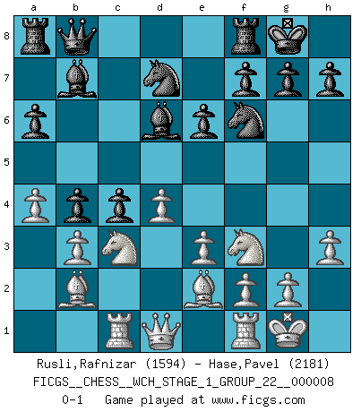 Last move : 0-1 2010 October 7 21:26:39 [Event "FICGS__CHESS__WCH_STAGE_1_GROUP_22__000008"] [Site "FICGS"] [Date "2010.08.13"] [Round "1"] [White "Rusli,Rafnizar"] [Black "Hase,Pavel"] [Result "0-1"] [WhiteElo "1594"] [BlackElo "2181"] 1.d4 Nf6 2.c4 e6 3.Nf3 d5 4.Nc3 c6 5.e3 Nbd7 6.Bd3 dxc4 7.Bxc4 b5 8.Bd3 Bd6 9.O-O Bb7 10.b3 O-O 11.Bb2 Qb8 12.h3 a6 13.Rc1 c5 14.a4 c4 15.Be2 b4 0-1 This chess game has been lost on time (started : 2010.08.13 14:27:7) Queen's pawn game Kingside Castling by player White (move 9) Kingside Castling by player Black (move 10) Player Black won this chess game. Follow this game move after move (download)Some part of a mistake is always correct. (Savielly Tartakover) Der Traum, für den ich lebe, ist der von einem freien Russland. Viele mögen sagen: Russland hat doch ein Parlament, einen gewählten Präsidenten. Aber ich spüre, dass in meiner Heimat die Angst wiederkehrt. Eine Angst, sich frei zu äußern, bestimmte Dinge zu tun (Garry Kasparov) En el Ajedrez, tal como en la vida, las bendiciones de hoy pueden ser el veneno del mañana. (Assaic) Vouloir jouer aux échecs contre soi-même est aussi paradoxal que vouloir marcher sur son ombre. (Stefan Zweig) Follow your passion, and success will follow you. (Arthur Buddhold)