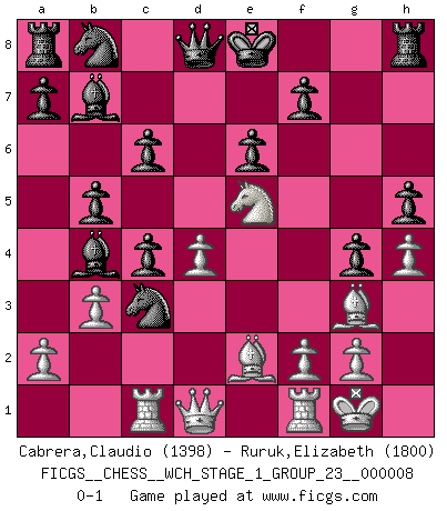 Last move : 0-1 2010 October 4 15:1:52 [Event "FICGS__CHESS__WCH_STAGE_1_GROUP_23__000008"] [Site "FICGS"] [Date "2010.08.13"] [Round "1"] [White "Cabrera,Claudio"] [Black "Ruruk,Elizabeth"] [Result "0-1"] [WhiteElo "1398"] [BlackElo "1800"] 1.Nf3 d5 2.d4 Nf6 3.c4 c6 4.Nc3 e6 5.Bg5 h6 6.Bh4 dxc4 7.e4 g5 8.Bg3 b5 9.h4 g4 10.Ne5 h5 11.Be2 Bb7 12.b3 Bb4 13.Rc1 Nxe4 14.O-O Nxc3 0-1 Reti Opening Kingside Castling by player White (move 14) Player Black won this chess game. Follow this game move after move (download)A Chess game is divided into three stages: the first, when you hope you have the advantage, the second when you believe you have an advantage, and the third... when you know you're going to lose ! (Savielly Tartakower) Offener Brief an US-Präsident Bush anlässlich der Verhaftung Bobby Fishers: Verhaften Sie mich. Stecken Sie mich in dieselbe Zelle wie Bobby Fisher und geben Sie uns ein Schachspiel mit. (Boris Vassilievich Spassky) Morphy probablemente fue el genio más grande de todos. (Bobby Fischer) Karpov est une pièce de musée. (Garry Kasparov) The real voyage of discovery consists not in seeking new lands but in seeing with new eyes. (Marcel Proust)