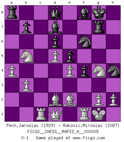 Last move : 0-1 2007 February 20 21:47:6 [Event "FICGS__CHESS__RAPID_A__000005"] [Site "FICGS"] [Date "2006.11.16"] [Round "1"] [White "Pech,Jaroslav"] [Black "Rakovic,Miroslav"] [Result "0-1"] [WhiteElo "1929"] [BlackElo "2087"] 1.d4 Nf6 2.c4 g6 3.Nc3 Bg7 4.e4 d6 5.Nf3 O-O 6.Be2 e5 7.O-O Nc6 8.d5 Ne7 9.Ne1 Nd7 10.Nd3 f5 11.Bd2 Nf6 12.f3 f4 13.c5 g5 14.Rc1 Ng6 15.cxd6 cxd6 16.Nb5 Rf7 17.Qc2 Ne8 18.a4 h5 19.Nf2 Bf8 20.Nxa7 Bd7 21.Nb5 Rg7 22.b3 Nh4 23.Qd1 g4 24.fxg4 hxg4 25.Nxg4 Nf6 0-1 King's Indian : Orthodox, Aronin-Taimanov variation (Yugoslav attack / Mar del Plata variation) Kingside Castling by player Black (move 5) Kingside Castling by player White (move 7) Player Black won this chess game. Follow this game move after move (download)A thorough understanding of the typical mating continuations makes the most complicated sacrificial combinations leading up to them not only not difficult, but almost a matter of course. (Siegbert Tarrasch) Ich hatte Zahnschmerzen im ersten Spiel. In der zweiten Partie tat mir der Kopf weh. In der dritten war es eine Rheuma-Attacke und während der vierten fühlte ich mich nicht gut. Und in der fünften? Nun, man muss doch nicht jedes Spiel gewinnen, oder? (Savielly Grigorievitsch Tartakower) Debes de llevar a tu oponente hacia un profundo y obscuro bosque donde 2+2=5, y el camino que conduce a la salida es suficientemente ancho para solamente uno. (Mikhail Tal) Ce qui caractérise les parties de combat, c'est que si le défenseur a constamment de difficiles problèmes à résoudre, l'attaquant doit chercher sans relâche de nouvelles possibilités d'attaque. (Koblentz) The various flowers seem good to different people. (Chinese proverb)