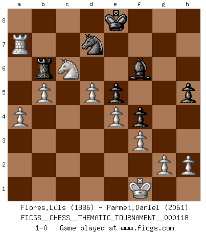 Last move : 1-0 2010 November 1 16:41:10 [Event "FICGS__CHESS__THEMATIC_TOURNAMENT__000118"] [Site "FICGS"] [Date "2010.08.13"] [Round "1"] [White "Flores,Luis"] [Black "Parmet,Daniel"] [Result "1-0"] [WhiteElo "1886"] [BlackElo "2061"] 1.d4 Nf6 2.c4 g6 3.Nc3 Bg7 4.e4 d6 5.Nf3 O-O 6.Be2 e5 7.O-O Nc6 8.d5 Ne7 9.Ne1 Nd7 10.Nd3 f5 11.Bd2 Nf6 12.f3 f4 13.c5 g5 14.cxd6 cxd6 15.Be1 Ng6 16.Rc1 Rf7 17.Bf2 h5 18.Qc2 Bd7 19.Qb3 g4 20.Nb5 g3 21.Nxd6 gxf2+ 22.Rxf2 Rf8 23.Nc5 Qb6 24.Qxb6 axb6 25.Nxd7 Nxd7 26.Rc7 Nc5 27.b4 Na6 28.Bxa6 bxa6 29.Rfc2 Nh4 30.Nc8 Rf7 31.Rxf7 Kxf7 32.Rc7+ Kg8 33.Nxb6 Rb8 34.Rc6 Kf7 35.a3 Ng6 36.Rc7+ Kg8 37.Nd7 Ra8 38.Rb7 Nf8 39.Nb6 Rd8 40.Ra7 Rb8 41.Rxa6 Bf6 42.Nc4 Kf7 43.Na5 Nd7 44.Ra7 Ke8 45.Nc6 Rb6 46.a4 Be7 47.b5 Bf6 48.Kf1 1-0 King's Indian : Orthodox, Aronin-Taimanov variation (Yugoslav attack / Mar del Plata variation) Kingside Castling by player Black (move 5) Kingside Castling by player White (move 7) Player White won this chess game. Follow this game move after move (download)Look at Garry Kasparov. After he loses, invariably he wins the next game. He just kills the next guy. That's something that we have to learn to be able to do. (Maurice Ashley) Wenn Du absolut nicht mehr weißt, was Du tun sollst, dann ist es Zeit für Panik. (John van der Wiel) ¿Porque tengo que perder ante este idiota?. (Aron Nimzovich) Horreur, mais aussi harmonie suprême : qu'y avait-il en effet au monde en dehors des échecs ? Le brouillard, l'inconnu, le non-être... (Vladimir Nabokov) The next best thing to gambling and winning is gambling and loosing. (Nick Dandalos)