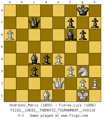 Last move : 0-1 2010 November 12 13:37:50 [Event "FICGS__CHESS__THEMATIC_TOURNAMENT__000118"] [Site "FICGS"] [Date "2010.08.13"] [Round "1"] [White "Andreoni,Mario"] [Black "Flores,Luis"] [Result "0-1"] [WhiteElo "1800"] [BlackElo "1886"] 1.d4 Nf6 2.c4 g6 3.Nc3 Bg7 4.e4 d6 5.f3 O-O 6.Be3 e5 7.Nge2 c6 8.Qc2 a6 9.dxe5 dxe5 10.Ng3 Be6 11.Bd3 Qe7 12.O-O Nbd7 13.Rad1 Rfd8 14.Be2 b5 15.cxb5 axb5 16.a3 Ne8 17.Rd2 Nd6 18.Rfd1 Nb7 19.Nb1 Na5 20.Rd3 Bf6 21.Nd2 c5 22.b4 c4 23.Rxd7 Rxd7 24.Bc5 Rxd2 25.Rxd2 Qc7 26.Bd6 Qb6+ 27.Bc5 Qc6 28.Rd6 Qc7 29.Rb6 Nb3 30.Rxb5 Nd4 31.Bxd4 exd4 32.Qb2 Qf4 33.Bd1 c3 34.Qe2 Rxa3 35.Ra5 Rxa5 36.bxa5 Qc7 37.a6 Bc4 0-1 King's Indian : Saemisch, Orthodox, 7.Nge2 c6 Kingside Castling by player Black (move 5) Kingside Castling by player White (move 12) Player Black won this chess game. Follow this game move after move (download)The passion for playing Chess is one of the most unaccountable in the world. (H.G. Wells) Ja, jede Frau in Holland liebt mich bestimmt, und alle Männer hassen mich. (Loek van Wely) El Ajedrez es el gimnasio de la mente. (Blaise Pascal) Votre seul travail dans les ouvertures est d'obtenir un milieu de partie jouable. (Lajos Portish) Humor is by far the most significant activity of the human brain. (Edward De Bono)
