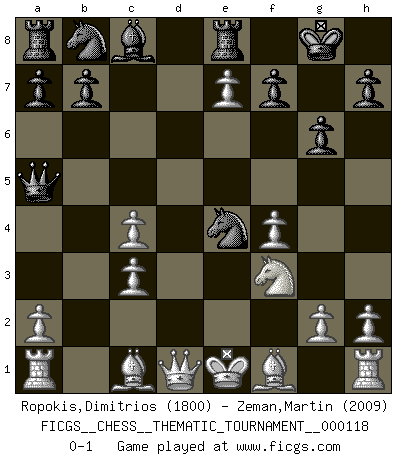 Last move : 0-1 2010 August 25 10:51:54 [Event "FICGS__CHESS__THEMATIC_TOURNAMENT__000118"] [Site "FICGS"] [Date "2010.08.13"] [Round "1"] [White "Ropokis,Dimitrios"] [Black "Zeman,Martin"] [Result "0-1"] [WhiteElo "1800"] [BlackElo "2009"] 1.d4 Nf6 2.c4 g6 3.Nc3 Bg7 4.e4 d6 5.f4 O-O 6.Nf3 c5 7.dxc5 Qa5 8.cxd6 Nxe4 9.dxe7 Bxc3+ 10.bxc3 Re8 0-1 King's Indian : Four pawns attack Kingside Castling by player Black (move 5) Player Black won this chess game. Follow this game move after move (download)It is the aim of the modern school, not to treat every position according to one general law, but according to the principle inherent in the position. (Richard Reti) Ich spiele ehrlich und spiele, um zu gewinnen. Wenn ich verliere nehme ich meine Medizin. (Robert James Fischer) El Ajedrez detiene a su maestro dentro de sus propios vínculos, encadenando la mente y el cerebro, por lo que la libertad interior del mas fuerte debe sufrir. (Albert Einstein) Il s'avisa de me proposer d'apprendre les échecs qu'il jouait un peu... me voilà forcené des échecs. J'achète un échiquier, je m'enferme dans ma chambre, j'y passe des jours et des nuits à vouloir apprendre par cur toutes les parties. (Jean-Jacques Rousseau, Confessions) A government big enough to give you everything you want is strong enough to take everything you have. (Thomas Jefferson)