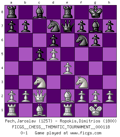 Last move : 0-1 2010 October 17 17:53:30 [Event "FICGS__CHESS__THEMATIC_TOURNAMENT__000118"] [Site "FICGS"] [Date "2010.08.13"] [Round "1"] [White "Pech,Jaroslav"] [Black "Ropokis,Dimitrios"] [Result "0-1"] [WhiteElo "1257"] [BlackElo "1800"] 1.d4 Nf6 2.c4 g6 3.Nc3 Bg7 4.e4 d6 5.Be2 O-O 6.Nf3 c5 7.d5 e6 8.O-O exd5 9.cxd5 Re8 10.Qc2 Qe7 11.Re1 Nbd7 0-1 King's Indian : 5.Be2 Kingside Castling by player Black (move 5) Kingside Castling by player White (move 8) Player Black won this chess game. Follow this game move after move (download)Chess is a terrible game. If you have no center, your opponent has a freer position. If you do have a center, then you really have something to worry about ! (Siegbert Tarrasch) Schach ist mein Leben, meine Leidenschaft, was ich gelernt habe und seit meinem 14. Lebensjahr profimässig praktiziere. Darauf zu verzichten, würde mir sehr schwer fallen. (Viktor Kortschnoi) El Ajedrez es una hermosa aventura. (Bent Larsen) Les échecs c'est le défi de l'alpiniste, toujours plus haut, prêt à tout pour monter à l'assaut du Roi ennemi. Les échecs, c'est de la musique en mouvement, un ballet majestueux pour les yeux. C'est de la poésie composée par les fantômes du passé qui au même titre que Rimbaud ou Verlaine méritent notre admiration. Les échecs, c'est de la peinture ou le moindre mouvement modifie le tableau pour en faire un Picasso ou un Van Gogh. Les échecs, c'est tout et rien, c'est la vie et la mort. Jjulie33 sur le forum de France-Echecs. Vladimir Ras-Putin is still alive... He is also a good actor, I saw him in the Lord of the Rings. (Rodolfo d'Ettorre)