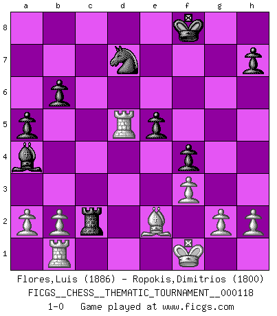 Last move : 1-0 2010 September 8 20:10:54 [Event "FICGS__CHESS__THEMATIC_TOURNAMENT__000118"] [Site "FICGS"] [Date "2010.08.13"] [Round "1"] [White "Flores,Luis"] [Black "Ropokis,Dimitrios"] [Result "1-0"] [WhiteElo "1886"] [BlackElo "1800"] 1.d4 Nf6 2.c4 g6 3.Nc3 Bg7 4.e4 d6 5.Be2 O-O 6.Nf3 c5 7.O-O cxd4 8.Nxd4 Nc6 9.Be3 Bd7 10.Qd2 Nxd4 11.Bxd4 Bc6 12.f3 a6 13.Rfd1 a5 14.c5 e5 15.Bf2 dxc5 16.Bxc5 Qxd2 17.Rxd2 Bh6 18.R2d1 Rfc8 19.Kf2 Nd7 20.Bd6 Bf8 21.Rac1 Bxd6 22.Rxd6 Kf8 23.Nd5 Ba4 24.Rb1 Rc2 25.Ne3 Rac8 26.Nxc2 Rxc2 27.Ke3 f5 28.exf5 gxf5 29.Rd5 f4+ 30.Kf2 b6 31.Kf1 1-0 King's Indian : 5.Be2 Kingside Castling by player Black (move 5) Kingside Castling by player White (move 7) Player White won this chess game. Follow this game move after move (download)One bad move nullifies forty good ones. (Horowitz) Kein Schachspieler kann gut schlafen. (H. G. Wells) Cada Peón es una Reina en potencia. (James Mason) Les échecs, c'est la lutte contre l'erreur. (Johannes Zukertort) The Movers & Shakers of this world are those who play chess in the mornings and go to the disco in the evenings. (Dinesh De Silva)