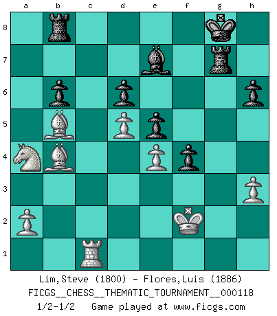Last move : 1/2-1/2 2010 October 18 11:23:45 [Event "FICGS__CHESS__THEMATIC_TOURNAMENT__000118"] [Site "FICGS"] [Date "2010.08.13"] [Round "1"] [White "Lim,Steve"] [Black "Flores,Luis"] [Result "1/2-1/2"] [WhiteElo "1800"] [BlackElo "1886"] 1.d4 Nf6 2.c4 g6 3.Nc3 Bg7 4.e4 d6 5.Nf3 O-O 6.Be2 e5 7.O-O Nc6 8.d5 Ne7 9.h3 Nd7 10.Be3 f5 11.Re1 f4 12.Bd2 h6 13.b4 b6 14.Na4 Nf6 15.Bd3 g5 16.c5 Ng6 17.cxd6 cxd6 18.Rc1 Rf7 19.Bb5 g4 20.hxg4 Nxg4 21.Rc3 Nh4 22.Qe2 a6 23.Bc6 Rb8 24.b5 axb5 25.Bxb5 Bf8 26.Rec1 Rg7 27.Nxh4 Qxh4 28.Rh3 Qxf2+ 29.Qxf2 Nxf2 30.Kxf2 Bxh3 31.gxh3 Be7 32.Bb4 1/2-1/2 King's Indian : Orthodox, Aronin-Taimanov variation (Yugoslav attack / Mar del Plata variation) Kingside Castling by player Black (move 5) Kingside Castling by player White (move 7) This chess game ended in a draw. Follow this game move after move (download)Chess books should be used as we use glasses: to assist the sight, although some players make use of them as if they thought they conferred sight. (Jose Raul Capablanca) Wenn sie aufgeben, dann danke ich Ihnen für das Spiel (Eventualzug beim Fernschach). (Anonymous) Por tratar de evitar la pérdida de una pieza, muchas personas han perdido una partida de Ajedrez. (Savielly Tartakover) Les échecs sont plus proches de l'art de l'assassinat que de l'art de la guerre. (Arturo Perez-Reverte) Life is pain my dear and anyone who says otherwise is selling something. (Princess Bride)