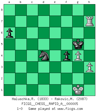 Last move : 1-0 2007 April 1 15:32:19 [Event "FICGS__CHESS__RAPID_A__000005"] [Site "FICGS"] [Date "2006.11.16"] [Round "1"] [White "Haluschka,Rainer"] [Black "Rakovic,Miroslav"] [Result "1-0"] [WhiteElo "1833"] [BlackElo "2087"] 1.d4 Nf6 2.c4 g6 3.Nf3 Bg7 4.g3 O-O 5.Bg2 d6 6.O-O Nbd7 7.Nc3 e5 8.e4 a6 9.Re1 exd4 10.Nxd4 Ng4 11.Qxg4 Bxd4 12.Qd1 Bg7 13.f4 Rb8 14.Qc2 Nf6 15.c5 dxc5 16.Rd1 Qe8 17.e5 Bf5 18.Qe2 Nd7 19.g4 Be6 20.Be3 c6 21.Ne4 b6 22.Rd2 f6 23.Nd6 Qe7 24.Bxc6 Rbd8 25.Rad1 Nb8 26.Be4 Bxa2 27.b4 fxe5 28.bxc5 Bb3 29.Rb1 exf4 30.Bf2 Bf7 31.Bxg6 Qxe2 32.Bxf7+ Rxf7 33.Rxe2 bxc5 34.Nxf7 Kxf7 35.Bxc5 Nc6 36.Re4 Bd4 37.Bxd4 Rxd4 38.Rb7+ Kf6 39.Rxd4 Nxd4 40.Rxh7 Kg5 41.h3 1-0 This chess game has been lost on time (started : 2006.11.16 15:13:27) King's Indian, 3.Nf3 Kingside Castling by player Black (move 4) Kingside Castling by player White (move 6) 10 pieces endgame at move 39 : White KRRPP , Black KNPPP WHITE : King + 2 Rooks 2 Pawns BLACK : King + 1 Knight 3 Pawns 9 pieces endgame at move 39 : White KRPP , Black KNPPP WHITE : King + 1 Rook 2 Pawns BLACK : King + 1 Knight 3 Pawns 8 pieces endgame at move 40 : White KRPP , Black KNPP WHITE : King + 1 Rook 2 Pawns BLACK : King + 1 Knight 2 Pawns Player White won this chess game. Follow this game move after move (download)There are two types of sacrifices: correct ones and mine. (Mikhail Tal) Im Reiche der Wirklichkeit ist man nie so glücklich wie im Reiche der Gedanken. (Arthur Schopenhauer) Todo lo que importa ante el tablero de Ajedrez son buenas jugadas. (Bobby Fischer) On croit qu'il y a plus de mauvais joueurs que de bons joueurs, c'est faux : Il y a autant de joueurs qui gagnent que de joueurs qui perdent. (Philippe Geluck) Opportunities multiply as they are seized. (Sun Tzu)