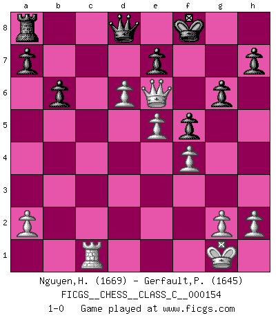 Last move : 1-0 2010 October 20 19:31:3 [Event "FICGS__CHESS__CLASS_C__000154"] [Site "FICGS"] [Date "2010.08.14"] [Round "1"] [White "Nguyen,Hao Nhien"] [Black "Gerfault,Pascal"] [Result "1-0"] [WhiteElo "1669"] [BlackElo "1645"] 1.c4 d5 2.cxd5 Nf6 3.Nc3 Nxd5 4.Nf3 g6 5.e4 Nxc3 6.bxc3 Bg7 7.d4 c5 8.Bb5+ Bd7 9.Bxd7+ Qxd7 10.O-O Nc6 11.Be3 O-O 12.Rc1 cxd4 13.cxd4 Rfd8 14.d5 Ne5 15.Nxe5 Bxe5 16.f4 Bg7 17.Bd4 Bxd4+ 18.Qxd4 b6 19.Rf3 Rdc8 20.Rfc3 Rxc3 21.Qxc3 f6 22.Qc6 Qd8 23.Qe6+ Kf8 24.e5 f5 25.d6 1-0 English Opening Kingside Castling by player White (move 10) Kingside Castling by player Black (move 11) Player White won this chess game. Follow this game move after move (download)If I win a tournament, I win it by myself. I do the playing. Nobody helps me. (Bobby Fischer) Die meiste Zeit treffe ich auf Gegner, die meine Enkel sein könnten. Ich bin da, um ihnen zu zeigen, dass sie von mir noch einiges lernen können. (Viktor Kortschnoi) Vive, pierde y aprende al observar a tu oponente como ganar. (Amber Steenbock) Il vaut mieux sacrifier les pièces de l'adversaire. (Xavier Tartacover) Indecision is the key to flexibility. (Unknown)