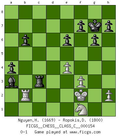 Last move : 0-1 2010 October 9 16:5:35 [Event "FICGS__CHESS__CLASS_C__000154"] [Site "FICGS"] [Date "2010.08.14"] [Round "1"] [White "Nguyen,Hao Nhien"] [Black "Ropokis,Dimitrios"] [Result "0-1"] [WhiteElo "1669"] [BlackElo "1800"] 1.d4 d5 2.Nf3 e6 3.e3 Nf6 4.Bd3 Bd6 5.O-O O-O 6.b3 c5 7.Bb2 Nc6 8.a3 b6 9.c4 cxd4 10.exd4 Bb7 11.Nc3 dxc4 12.bxc4 Rc8 13.Rc1 Bf4 14.Rc2 Na5 15.Ne2 Bxf3 16.gxf3 Qd6 17.Ng3 Nc6 18.Kh1 Rfd8 19.Qe2 Nxd4 20.Bxd4 Qxd4 21.Be4 Rc5 22.Kg2 Ra5 23.Ra2 Nxe4 24.fxe4 g6 25.Rb1 Rc8 26.Rb4 Kg7 27.Nf1 Rg5+ 28.Kh1 a5 29.Rb5 Rxc4 30.Rxg5 Bxg5 31.f3 a4 32.Kg2 Rc3 33.Qf2 Qxf2+ 34.Kxf2 Be7 35.Rb2 Bxa3 0-1 Queen's pawn game Kingside Castling by player White (move 5) Kingside Castling by player Black (move 5) Player Black won this chess game. Follow this game move after move (download)No other master has such a terrific will to win. At the board he radiates danger, and even the strongest opponents tend to freeze, like rabbits when they smell a panther. Even his weaknesses are dangerous. As white, his opening game is predictable - you can make plans against it - but so strong that your plans almost never work. In the middle game his precision and invention are fabulous, and in the end game you simply cannot beat him. (Anonymous German Expert) Sitze auf Deine Hände. (Siegbert Tarrasch) No hay precio que no valga la pena por la cabellera del Rey enemigo. (Koblentz) Les échecs sont un jeu terrible. Si vous n'avez pas le centre, votre adversaire a une position plus libre. Par contre, si vous avez le centre, alors vous avez vraiment quelque chose pour laquelle vous inquiéter ! (Siegbert Tarrasch) Yoga is 99% practice and 1% knowledge. (Sri Krishna Pattabhi Jois)