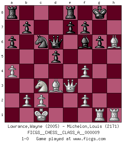 Last move : 1-0 2007 January 5 22:39:21 [Event "FICGS__CHESS__CLASS_A__000009"] [Site "FICGS"] [Date "2006.11.18"] [Round "1"] [White "Lowrance,Wayne"] [Black "Michelon,Louis"] [Result "1-0"] [WhiteElo "2005"] [BlackElo "2171"] 1.e4 Nf6 2.e5 Nd5 3.Nc3 Nb6 4.d4 d6 5.Nf3 g6 6.exd6 cxd6 7.Bb5+ Bd7 8.a4 Bg7 9.h4 O-O 10.h5 Bg4 11.hxg6 hxg6 12.Bh6 a6 13.Bd3 Nc6 14.Qd2 Bxf3 15.gxf3 Bxd4 16.O-O-O Re8 17.Rdg1 Bf6 18.Qe3 Qd7 19.Qxb6 d5 20.Qe3 Qd6 21.f4 1-0 Alekhine's defense : Saemisch attack Kingside Castling by player Black (move 9) Queenside Castling by player White (move 16) Player White won this chess game. Follow this game move after move (download)A win by an unsound combination, however showy, fills me with artistic horror. (Wilhelm Steinitz) Sehr viele beherrschen heutzutage das große Einmalseins des Schachspiels und kennen sogar dessen Logarithmentafeln auswendig - deshalb sollte man hin und wieder zu beweisen trachten, dass zwei mal zwei auch fünf sein kann. (Mikhail Nekhemyevich Tal) Si un gobernante no entiende al Ajedrez, ¿como puede governar él un reinado?. (El Rey Khusros II) On a dit que l'homme se distingue de l'animal par le fait qu'il achète plus de livres qu'il ne peut en lire. Je voudrais suggérer qu'inclure à la liste des livres quelques livres d'échecs rendrait la distinction manifeste. (Edward Lasker) Indecision is the key to flexibility. (Unknown)