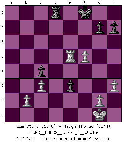 Last move : 1/2-1/2 2011 July 11 13:47:38 [Event "FICGS__CHESS__CLASS_C__000154"] [Site "FICGS"] [Date "2010.08.14"] [Round "1"] [White "Lim,Steve"] [Black "Hasyn,Thomas"] [Result "1/2-1/2"] [WhiteElo "1800"] [BlackElo "1644"] 1.e4 c5 2.Nf3 d6 3.Bc4 Nf6 4.Nc3 Nc6 5.d4 cxd4 6.Nxd4 Qb6 7.Nb3 e6 8.Be3 Qc7 9.Be2 a6 10.a4 Be7 11.a5 O-O 12.Bb6 Qb8 13.O-O Nd7 14.Be3 Nc5 15.Nd2 b6 16.axb6 Qxb6 17.Na4 Qc7 18.Nxc5 dxc5 19.c3 Rd8 20.f4 a5 21.Qc2 Ba6 22.Bxa6 Rxa6 23.Nc4 R6a8 24.f5 Ne5 25.Bf4 Bd6 26.Nxd6 Qxd6 27.Qe2 exf5 28.exf5 Re8 29.Rfd1 Qc7 30.Rd5 f6 31.h3 Rad8 32.Qd2 c4 33.Bxe5 fxe5 34.Rd1 Rxd5 35.Qxd5+ Kf8 36.Ra1 Qb6+ 37.Kh2 e4 38.Rxa5 Qc7+ 39.Kg1 Rd8 40.Qc5+ Qxc5+ 41.Rxc5 e3 42.Re5 1/2-1/2 Sicilian Kingside Castling by player Black (move 11) Kingside Castling by player White (move 13) This chess game ended in a draw. Follow this game move after move (download)If your opponent cannot do anything active, then don't rush the position; instead you should let him sit there, suffer, and beg you for a draw. (Jeremy Silman) In Buenos Aires ist es nicht mein vorrangiges Ziel ein starkes Turnier zu organisieren, sondern ein Turnier für Gentlemen. Ich würde nie Kamsky einladen. Ich mag keine Probleme. (Miguel Najdorf) ¡Examina movidas que hagan daño! Un buen ojo for movidas desvastantes es mucho mas importante que el conocimiento de principios estratégicos. (Purdy) Les échecs, c'est la lutte contre l'erreur. (Johannes Zukertort) I don't believe in psychology. I believe in good moves. (Bobby Fischer)
