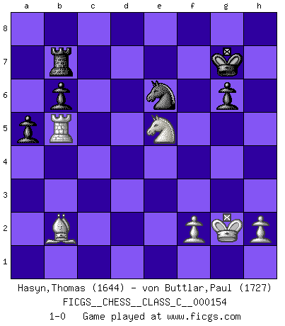 Last move : 1-0 2011 January 6 9:50:20 [Event "FICGS__CHESS__CLASS_C__000154"] [Site "FICGS"] [Date "2010.08.14"] [Round "1"] [White "Hasyn,Thomas"] [Black "von Buttlar,Paul"] [Result "1-0"] [WhiteElo "1644"] [BlackElo "1727"] 1.e4 e6 2.d4 d5 3.Nd2 Nf6 4.e5 Nfd7 5.c3 c5 6.Bd3 Nc6 7.Ne2 cxd4 8.cxd4 f6 9.exf6 Nxf6 10.O-O Bd6 11.Nf3 Qc7 12.Bg5 O-O 13.Rc1 Ne4 14.Bh4 Qa5 15.a3 Rxf3 16.gxf3 Nd2 17.b4 Nxf3+ 18.Kh1 Qxa3 19.Bxh7+ Kxh7 20.Rc3 Qxb4 21.Rxf3 e5 22.Rg1 Bf8 23.dxe5 Bg4 24.Qc2+ Qe4 25.Qxe4+ dxe4 26.Rxf8 Bf3+ 27.Rxf3 exf3 28.Nf4 Nxe5 29.Ne6 g6 30.Bf6 Nf7 31.Nd4 a5 32.Rb1 Ra6 33.Be7 b6 34.Nxf3 Kg7 35.Kg2 Ra7 36.Ba3 Rb7 37.Rb5 Nd8 38.Ne5 Ne6 39.Bb2 1-0 French : Tarrasch, Closed variation Kingside Castling by player White (move 10) Kingside Castling by player Black (move 12) Player White won this chess game. Follow this game move after move (download)When you don't know what to play, wait for an idea to come into your opponent's mind. You may be sure that idea will be wrong. (Siegbert Tarrasch) Der Verteidiger gebe der Gewalt nach, aber nur der Gewalt. Er schaffe sich nicht freiwillig, etwa aus Blindheit oder aus Schrecken, irgendwelche Schwächen. Er lasse sich nicht bluffen. (Emanuel Lasker) El ganar no lo es todo... pero el perder es nada. (Mednis) Pour moi, les échecs ne sont pas un jeu mais un art. (Alexandre Alekhine) Wisdom begins at the end. (Daniel Webster)