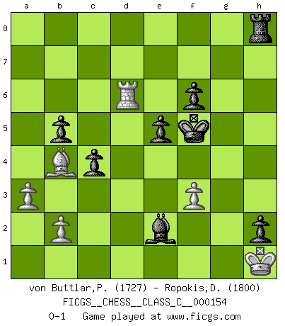 Last move : 0-1 2010 August 28 15:55:19 [Event "FICGS__CHESS__CLASS_C__000154"] [Site "FICGS"] [Date "2010.08.14"] [Round "1"] [White "von Buttlar,Paul"] [Black "Ropokis,Dimitrios"] [Result "0-1"] [WhiteElo "1727"] [BlackElo "1800"] 1.c4 c5 2.Nc3 Nc6 3.Nf3 Nf6 4.d4 cxd4 5.Nxd4 e6 6.g3 Qb6 7.Ndb5 Ne5 8.Bf4 Nfg4 9.e3 a6 10.h3 axb5 11.hxg4 Nxc4 12.Qb3 d5 13.Bxc4 dxc4 14.Qxb5+ Qxb5 15.Nxb5 Ra5 16.Nd6+ Bxd6 17.Bxd6 Ra6 18.Bb4 e5 19.a3 Bxg4 20.Rh4 h5 21.Rc1 b5 22.Rc2 g5 23.Rh2 Bf3 24.Rd2 f6 25.Bc5 Kf7 26.Bb4 R6a8 27.Rd7+ Ke6 28.Rd6+ Kf5 29.Kd2 h4 30.gxh4 Rxh4 31.Rxh4 gxh4 32.e4+ Bxe4 33.Ke3 h3 34.f3 Bd3 35.Kf2 h2 36.Kg2 Rh8 37.Kh1 Be2 0-1 English : Symmetrical, Four knights system Player Black won this chess game. Follow this game move after move (download)There's never before been a Chess player with such a thorough knowledge of the intricacies of the game and such an absolutely indomitable will to win. I think Bobby is the greatest player that ever lived. (Lisa Lane) Obendrein hat der FIDE-Präsident den Revolutionsführer Gaddafi zum »Großmeister« ernannt, am Ende der WM. Das ist lächerlich! (Joel Lautier) Botvinnik trató de alejar el misterio referente al Ajedrez, siempre relacionandolo a situaciones de la vida diaria. Solía llamar al Ajedrez un problema inexacto típico, similar a aquellos en que la gente tiene siempre que resolver a cada día. (Garry Kasparov) Il (Jacob Murray) ne joue pas pour le bon coup, mais pour le meilleur. (Eloi Relange) Being number two sucks. (Andre Agassi)