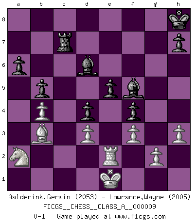 Last move : 0-1 2007 August 4 14:1:48 [Event "FICGS__CHESS__CLASS_A__000009"] [Site "FICGS"] [Date "2006.11.18"] [Round "1"] [White "Aalderink,Gerwin"] [Black "Lowrance,Wayne"] [Result "0-1"] [WhiteElo "2053"] [BlackElo "2005"] 1.Nf3 d5 2.b3 Nf6 3.Bb2 g6 4.e3 Bg7 5.c4 O-O 6.cxd5 Qxd5 7.Bc4 Qa5 8.O-O c5 9.Bc3 Qc7 10.d3 Nc6 11.Nbd2 Bf5 12.Rc1 Rad8 13.Qc2 Qb8 14.a4 a6 15.a5 Qc7 16.Ra1 e5 17.Ne4 Nd5 18.h3 Nxc3 19.Qxc3 Kh8 20.Rfc1 Qe7 21.Qe1 Bd7 22.Nc3 Nb4 23.Qe2 Bc6 24.Rab1 Rd7 25.Rd1 Qd8 26.e4 Qxa5 27.Qe3 Nc2 28.Qd2 Nd4 29.Nxd4 cxd4 30.Ne2 Qxd2 31.Rxd2 Bh6 32.Ra2 Rc7 33.Rf1 f5 34.exf5 gxf5 35.b4 f4 36.f3 b5 37.Be6 Rf6 38.Bb3 Bb7 39.Rc1 Rxc1+ 40.Nxc1 Bf8 41.Re2 Bd6 42.Kf2 Rf8 43.Na2 Rc8 44.Be6 Rc7 45.Bb3 Bc8 46.Ke1 Bf5 0-1 This chess game has been lost on time (started : 2006.11.18 10:41:38) Reti : Nimzovich-Larsen attack Kingside Castling by player Black (move 5) Kingside Castling by player White (move 8) Player Black won this chess game. Follow this game move after move (download)For surely of all the drugs in the world, Chess must be the most permanently pleasurable. (Assiac) Der Traum, für den ich lebe, ist der von einem freien Russland. Viele mögen sagen: Russland hat doch ein Parlament, einen gewählten Präsidenten. Aber ich spüre, dass in meiner Heimat die Angst wiederkehrt. Eine Angst, sich frei zu äußern, bestimmte Dinge zu tun (Garry Kasparov) Es el objetivo de la escuela moderna no tratar cada posición de acuerdo a una regla general, sino de acuerdo al principio inherente en la posición. (Richard Reti) Les Echecs mettent en conflit, non pas deux intelligences, mais deux volontés. (Lasker) Memory is a way of holding onto the things you love, the things you are, the things you never want to lose. (from the television show: The Wonder Years)