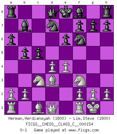 Last move : 0-1 2010 November 5 9:53:14 [Event "FICGS__CHESS__CLASS_C__000154"] [Site "FICGS"] [Date "2010.08.14"] [Round "1"] [White "Herman,Herdiansyah"] [Black "Lim,Steve"] [Result "0-1"] [WhiteElo "1800"] [BlackElo "1800"] 1.d4 Nf6 2.c4 e6 3.Nf3 d5 4.Nc3 c6 5.e3 Nbd7 6.Bd3 dxc4 7.Bxc4 b5 8.Bd3 Bb7 9.O-O a6 10.e4 c5 0-1 This chess game has been lost on time (started : 2010.08.14 17:35:42) Queen's pawn game Kingside Castling by player White (move 9) Player Black won this chess game. Follow this game move after move (download)I thought the most common mistake [in chess] was the first one: Learning the game :P (Garvin Gray, FICGS forum) Wie, soll nun auch die Opposition abgeschafft werden? Ja, es tut mir leid, Ihnen diesen Schmerz nicht ersparen zu können. (Aaron Nimzowitsch) El Ajedrez es un cuento de Hadas de las 1001 metidas de pata. (Savielly Tartakower) La menace est plus forte que l'exécution. (Aaron Nimzovitch) Humor is by far the most significant activity of the human brain. (Edward De Bono)