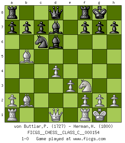 Last move : 1-0 2010 November 4 21:53:44 [Event "FICGS__CHESS__CLASS_C__000154"] [Site "FICGS"] [Date "2010.08.14"] [Round "1"] [White "von Buttlar,Paul"] [Black "Herman,Herdiansyah"] [Result "1-0"] [WhiteElo "1727"] [BlackElo "1800"] 1.c4 e5 2.Nc3 Nf6 3.Nf3 Nc6 4.e3 d5 5.cxd5 Nxd5 6.Bb5 Nxc3 7.bxc3 Bd6 8.d4 exd4 9.cxd4 Bd7 10.O-O O-O 11.Bb2 1-0 This chess game has been lost on time (started : 2010.08.14 17:35:42) English Opening Kingside Castling by player White (move 10) Kingside Castling by player Black (move 10) Player White won this chess game. Follow this game move after move (download)By this measure (on the gap between Fischer & his contemporaries), I consider him the greatest world champion. (Garry Kasparov) Ein Remis kann durch Wiederholung von drei Zügen oder durch einen schlechte Zug erreicht werden. (Savielly Grigorievitsch Tartakower) Bendita sea la memoria de aquel que dio al mundo este juego inmortal. (A. G. Gardiner) Il vaut mieux sacrifier les pièces de l'adversaire. (Xavier Tartacover) I fear not the man who has practiced 10,000 kicks once, but I fear the man who has practiced one kick 10,000 times. (Bruce Lee)