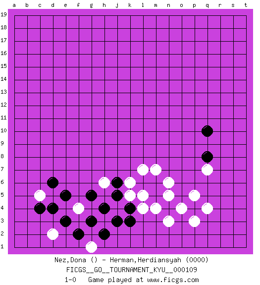 Last move : 1-0 2010 October 9 21:31:5 [Event "FICGS__GO__TOURNAMENT_KYU__000109"] [Site "FICGS"] [Date "2010.08.15"] [Round "1"] [Black "Nez,Dona"] [White "Herman,Herdiansyah"] [Result "1-0"] [Rating 2 "0000"] 1.p4 q4 2.q10 p5 3.k4 o4 4.d4 p3 5.d6 l4 6.q8 k5 7.k3 q7 8.l6 l5 9.j5 k6 10.j3 l7 11.m6 n6 12.h4 m7 13.m5 m4 14.j6 n5 15.g5 h6 16.g3 f4 17.h2 n3 18.f2 g1 19.e3 d2 20.e5 c5 21.c4 1-0 This go game has been lost on time (started : 2010.08.15 2:48:40) Here are the names of the openings (joseki) played in the four corners : Corner q4 : p4 q4 Takamoku (Gomok, Gaomu`) 5-4 Point. The takamoku (high) point (5-4). With its emphasis on influence, the 5-4 point complements the 4-4 (hoshi) point in creating an influence-oriented fuseki. Player Black won this Go (weiqi, baduk) game. Follow this game move after move (download)Win the stones, lose the game. (Anonymous) The leaves of memory seemed to make a mournful rustling in the dark. (Henry Wadsworth Longfellow)