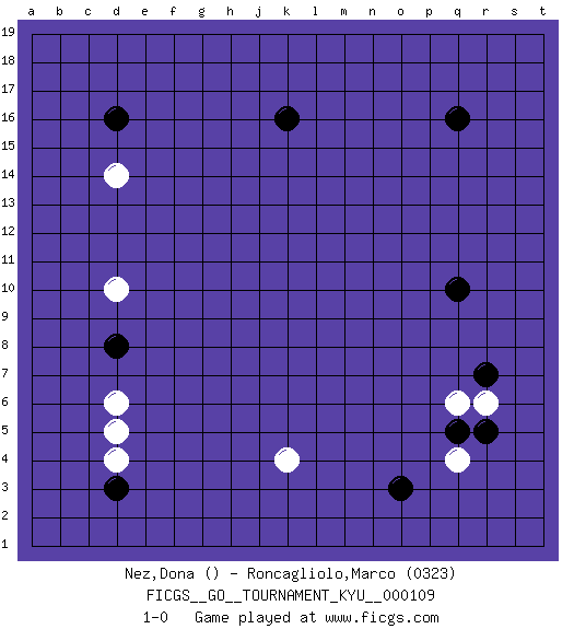 Last move : 1-0 2010 October 9 9:31:27 [Event "FICGS__GO__TOURNAMENT_KYU__000109 "] [Site "FICGS"] [Date "2010.08.15"] [Round "1"] [Black "Nez,Dona "] [White "Roncagliolo,Marco "] [Result "1-0"] [Rating 2 "0323"] 1.q16 d4 2.d8 q4 3.d3 d5 4.r7 d6 5.k16 d10 6.d16 k4 7.q10 d14 8.o3 q6 9.r5 r6 10.q5 1-0 This go game has been lost on time (started : 2010.08.15 2:48:40) Here are the names of the openings (joseki) played in the four corners : Corner d4 : d4 d8Hoshi (Hwajeom, Seongjeom, Xingwei`) 4-4 Point. The star or hoshi (4-4) point, emphasizing influence at the potential expense of territory. Corner q4 : q4 r7Hoshi (Hwajeom, Seongjeom, Xingwei`) 4-4 Point. The star or hoshi (4-4) point, emphasizing influence at the potential expense of territory.Niken Kakari (Dukan Keolch'im, E`r Gua`jiao~, 2-Space Low Approach). White typically answers by 7-3 or 3-5 (which is not joseki). Corner d16 : d16 d14Hoshi (Hwajeom, Seongjeom, Xingwei`) 4-4 Point. The star or hoshi (4-4) point, emphasizing influence at the potential expense of territory.Ikken Takagakari (Hankan Nop'dakeolch'im, Yi Gaojia, 1-Space High Approach). Black typically responds at 6-4 or 3-10. Black 4-10 is played when Black finds play on the right side advantageous. Black 4-8 or 3-8 may be played when Black has support at top. Player Black won this Go (weiqi, baduk) game.Follow this game move after move (download ) One big eye kills one small eye. (Anonymous) The greatest con, that he ever pulled... was making you believe... that he is you. (Revolver, movie)