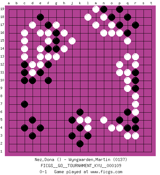 Last move : 0-1 2010 December 28 10:56:41 [Event "FICGS__GO__TOURNAMENT_KYU__000109"] [Site "FICGS"] [Date "2010.08.15"] [Round "1"] [Black "Nez,Dona"] [White "Wyngaarden,Martin"] [Result "0-1"] [Rating 2 "0137"] 1.e4 p16 2.d5 j15 3.p17 q9 4.q4 c15 5.c10 d11 6.k4 r6 7.q12 p11 8.c7 o16 9.r4 r12 10.r11 r13 11.q16 q15 12.c11 d12 13.c4 q11 14.r10 q10 15.d3 p4 16.r9 q13 17.r17 p12 18.q18 l4 19.l3 l5 20.j3 o4 21.k2 k5 22.j5 o17 23.o18 r8 24.d16 d17 25.n17 n16 26.p5 n5 27.d10 m17 28.m18 n18 29.p19 l18 30.n19 m19 31.q6 r7 32.r5 e16 33.d15 c16 34.d14 c13 35.d13 c14 36.c12 e12 37.e11 f13 38.e15 f15 39.f14 e13 40.g14 e14 41.f10 g13 42.g15 h16 43.f12 h14 44.g16 g17 45.f17 f16 46.e18 q3 47.k6 r3 0-1 This go game has been lost on time (started : 2010.08.15 2:48:40) Here are the names of the openings (joseki) played in the four corners : Corner q16 : p16 p17 Takamoku (Gomok, Gaomu`) 5-4 Point. The takamoku (high) point (5-4). With its emphasis on influence, the 5-4 point complements the 4-4 (hoshi) point in creating an influence-oriented fuseki. Corner q4 : q9 q4 This joseki is unknown. A weak or weird move has probably been played in this corner. Player White won this Go (weiqi, baduk) game. Follow this game move after move (download)The enemy's vital point is your own. (Anonymous) Always be a first-rate version of yourself, instead of a second-rate version of somebody else. (Judy Garland)