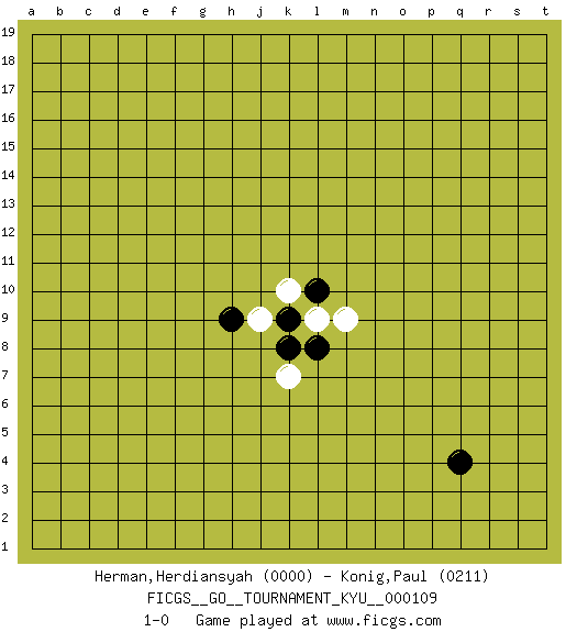 Last move : 1-0 2010 October 16 21:57:40 [Event "FICGS__GO__TOURNAMENT_KYU__000109"] [Site "FICGS"] [Date "2010.08.15"] [Round "1"] [Black "Herman,Herdiansyah"] [White "Konig,Paul"] [Result "1-0"] [Rating 1 "0000"] [Rating 2 "0211"] 1.q4 k10 2.l10 l9 3.k9 j9 4.k8 k7 5.l8 m9 6.h9 1-0 This go game has been lost on time (started : 2010.08.15 2:48:40) Here are the names of the openings (joseki) played in the four corners : Corner q4 : q4 l9 Hoshi (Hwajeom, Seongjeom, Xingwei`) 4-4 Point. The star or hoshi (4-4) point, emphasizing influence at the potential expense of territory. Corner d4 : j9 h9 This joseki is unknown. A weak or weird move has probably been played in this corner. Player Black won this Go (weiqi, baduk) game. Follow this game move after move (download)A basic: Don't push too hard. (Jansteen) To steal ideas from one person is plagiarism. To steal from many is research. (Unknown)