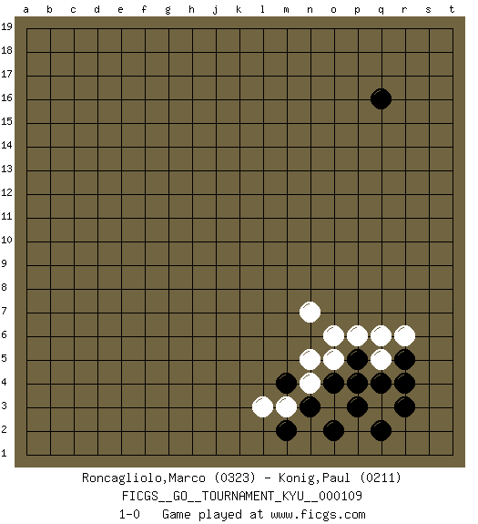 Last move : 1-0 2010 November 3 9:45:49 [Event "FICGS__GO__TOURNAMENT_KYU__000109"] [Site "FICGS"] [Date "2010.08.15"] [Round "1"] [Black "Roncagliolo,Marco"] [White "Konig,Paul"] [Result "1-0"] [Rating 1 "0323"] [Rating 2 "0211"] 1.r3 o6 2.q16 q5 3.q4 p4 4.r5 q3 5.r4 r6 6.p5 q6 7.p3 o5 8.o4 p6 9.q2 n4 10.p4 n7 11.n3 m3 12.m4 n5 13.m2 l3 14.o2 1-0 This go game has been lost on time (started : 2010.08.15 2:48:40) Here are the names of the openings (joseki) played in the four corners : Corner q4 : r3 o6 San-San (Sam-Sam, San-San) 3-3 Point. The San-San (3-3) point, emphasizing territory at the expense of influence. Player Black won this Go (weiqi, baduk) game. Follow this game move after move (download)In the opening, when you don't know what to play, make a shimari. (Jansteen) Perhaps chess is the wrong game for the times (The Chess Master and the Computer, by Garry Kasparov - 2010)