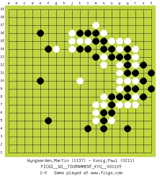 Last move : 1-0 2010 November 9 9:53:32 [Event "FICGS__GO__TOURNAMENT_KYU__000109"] [Site "FICGS"] [Date "2010.08.15"] [Round "1"] [Black "Wyngaarden,Martin"] [White "Konig,Paul"] [Result "1-0"] [Rating 1 "0137"] [Rating 2 "0211"] 1.q4 k10 2.r9 p10 3.q11 p11 4.q12 p12 5.p13 p14 6.q14 q15 7.e16 g14 8.f14 r14 9.q13 r13 10.o13 n13 11.o14 p15 12.e10 q10 13.n14 n12 14.f5 r12 15.l4 o15 16.r11 r10 17.n15 n16 18.m15 l15 19.m16 m17 20.s10 s11 21.l16 m14 22.k16 j16 23.l14 k15 24.m13 j15 25.k14 j14 26.s12 r8 27.t11 s9 28.q9 p9 29.q8 q7 30.p8 p7 31.o8 n8 32.o7 n7 33.o6 o5 34.n6 m6 35.n5 m5 36.n4 m7 37.s8 r7 38.t9 1-0 This go game has been lost on time (started : 2010.08.15 2:48:40) Here are the names of the openings (joseki) played in the four corners : Corner q16 : q11 p11 This joseki is unknown. A weak or weird move has probably been played in this corner. Corner d16 : e16 g14 Takamoku (Gomok, Gaomu`) 5-4 Point. The takamoku (high) point (5-4). With its emphasis on influence, the 5-4 point complements the 4-4 (hoshi) point in creating an influence-oriented fuseki. Player Black won this Go (weiqi, baduk) game. Follow this game move after move (download)Don't get surrounded ! Ever ! (Anonymous) Memory is a complicated thing, a relative to truth, but not its twin. (Barbara Kingsolver, Animal Dreams)