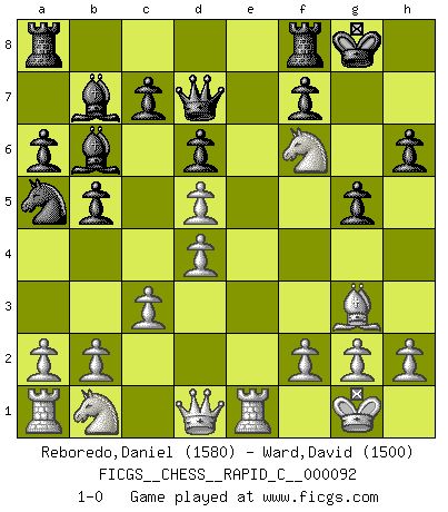 Last move : 1-0 2010 September 1 2:26:6 [Event "FICGS__CHESS__RAPID_C__000092"] [Site "FICGS"] [Date "2010.08.15"] [Round "1"] [White "Reboredo,Daniel"] [Black "Ward,David"] [Result "1-0"] [WhiteElo "1580"] [BlackElo "1500"] 1.e4 e5 2.Nf3 Nc6 3.Bb5 a6 4.Ba4 Nf6 5.O-O b5 6.Bb3 Bb7 7.Re1 Bc5 8.c3 d6 9.d4 Bb6 10.Bg5 h6 11.Bh4 g5 12.Bg3 Qe7 13.Bd5 Nxd5 14.exd5 Na5 15.Nxe5 O-O 16.Ng4 Qd7 17.Nf6+ 1-0 Ruy Lopez : Archangelsk (counterthrust) variation Kingside Castling by player White (move 5) Kingside Castling by player Black (move 15) Player White won this chess game. Follow this game move after move (download)The hardest game to win is a won game. (Emanuel Lasker) Karpov ist ein Museumsstück. (Garry Kasparov) Si tu oponente te ofrece un empate, trata de averiguar porque piensa él que esta en una posición peor. (Nigel Short) Même si vous avez un bon coup à faire, regardez toujours s'il n'y en a pas un qui lui soit préférable. (Pedro Damiano) If only people were all showed a certain minimum level of niceness; if only people didn't retract verbal draw offers (without draw box ticked) on ficgs; if only people didn't kill; if only people didn't run concentration / extermination camps, if only people didn't drop nuclear bombs on Hiroshima and Nagasaki, and so on - it would be a much more beautiful world. But sadly, things are not so... (Normajean Yates)