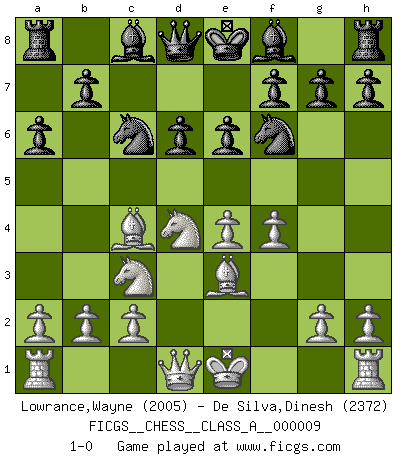 Last move : 1-0 2007 January 15 12:22:16 [Event "FICGS__CHESS__CLASS_A__000009"] [Site "FICGS"] [Date "2006.11.18"] [Round "1"] [White "Lowrance,Wayne"] [Black "De Silva,Dinesh"] [Result "1-0"] [WhiteElo "2005"] [BlackElo "2372"] 1.e4 c5 2.Nc3 Nc6 3.Nf3 d6 4.d4 cxd4 5.Nxd4 Nf6 6.Bc4 e6 7.Be3 a6 8.f4 1-0 This chess game has been lost on time (started : 2006.11.18 10:41:38) Sicilian : Closed, 2...Nc6 Player White won this chess game. Follow this game move after move (download)It is peculiar but a fact nevertheless, that gamblers in chess always have enthusiastic followers. (Botvinnik) Ich verstehe den Grund nicht, warum die Aufteilung in Frauen und Männer überhaupt im Schach besteht. (Judith Polgar) Con o sin el título, Bobby Fischer fue sin lugar a dudas el mas grande jugador de su época. (Burt Hochberg) Mon pion favori sur ma case favorite ! Bronstein en parlant d'un coup de pion en h5 quand il avait les Noirs. You can think I'm wrong, but that's no reason to quit thinking. (Gregory House, House M.D.)