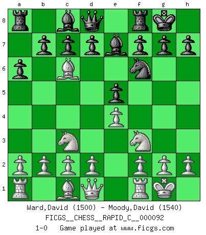 Last move : 1-0 2010 August 17 0:21:11 [Event "FICGS__CHESS__RAPID_C__000092"] [Site "FICGS"] [Date "2010.08.15"] [Round "1"] [White "Ward,David"] [Black "Moody,David"] [Result "1-0"] [WhiteElo "1500"] [BlackElo "1540"] 1.e4 e5 2.Nf3 Nc6 3.Bb5 a6 4.Ba4 Nf6 5.Nc3 Be7 6.O-O O-O 7.Bxc6 1-0 Ruy Lopez : Four knights (Tarrasch) variation Kingside Castling by player White (move 6) Kingside Castling by player Black (move 6) Player White won this chess game. Follow this game move after move (download)All my games are real. (Bobby Fischer) Als ich elf wurde, wurde ich einfach gut. (Robert James Fischer) No todos los artistas son jugadores de Ajedrez, pero todos los jugadores de Ajedrez son artistas. (Marcel Duchamp) Les échecs, c'est l'art d'analyser. (Mikhail Botvinnik) The difference between stupidity and genius is that genius has its limits. (Murphy)