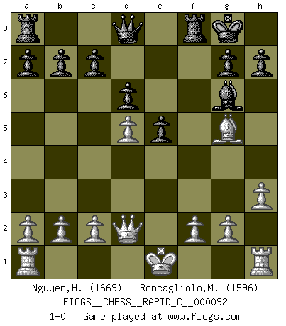 Last move : 1-0 2010 October 16 9:52:20 [Event "FICGS__CHESS__RAPID_C__000092"] [Site "FICGS"] [Date "2010.08.15"] [Round "1"] [White "Nguyen,Hao Nhien"] [Black "Roncagliolo,Marco"] [Result "1-0"] [WhiteElo "1669"] [BlackElo "1596"] 1.e4 e5 2.Nc3 Nf6 3.Nf3 Nc6 4.Bc4 Be7 5.d3 O-O 6.Be3 d6 7.Qd2 Na5 8.Nd5 Nxc4 9.dxc4 Nxd5 10.cxd5 f5 11.exf5 Bxf5 12.h3 Bg6 13.Ng5 Bxg5 14.Bxg5 1-0 This chess game has been lost on time (started : 2010.08.15 4:53:41) Vienna : Falkbeer variation Kingside Castling by player Black (move 5) Player White won this chess game. Follow this game move after move (download)In Chess, at least, the brave inherit the earth. (Edmar Mednis) Man gibt nur Pakete auf. (Paul Keres) El poder defensivo de una pieza clavada, solamente es imaginario. (Aaron Nimzovich) Les sacrifices démontrent seulement que quelqu'un a gaffé. (Savielly Tartacover) Life is pleasant. Death is peaceful. It's the transition that's troublesome. (Isaac Asimov)