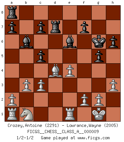 Last move : 1/2-1/2 2007 January 14 13:27:36 [Event "FICGS__CHESS__CLASS_A__000009"] [Site "FICGS"] [Date "2006.11.18"] [Round "1"] [White "Crozey,Antoine"] [Black "Lowrance,Wayne"] [Result "1/2-1/2"] [WhiteElo "2291"] [BlackElo "2005"] 1.e4 e5 2.Nf3 Nc6 3.Bb5 Nf6 4.O-O Bc5 5.c3 O-O 6.d4 Bb6 7.Bg5 h6 8.Bh4 d6 9.Qd3 g5 10.Bxc6 bxc6 11.Bg3 Re8 12.dxe5 dxe5 13.Qxd8 Rxd8 14.Re1 Nd7 15.Nxe5 Nxe5 16.Bxe5 Be6 17.Bf6 Rd7 18.h3 Kh7 19.b3 Kg6 20.Bd4 c5 1/2-1/2 Ruy Lopez : Berlin defense, Beverwijk variation Kingside Castling by player White (move 4) Kingside Castling by player Black (move 5) This chess game ended in a draw. Follow this game move after move (download)My opponents make good moves too. Sometimes I don't take these things into consideration. (Bobby Fischer) Verschiedene, sehr schätzbare und im Laufe des Lebens nützliche Eigenschaften des Geistes können durch das Schachspiel erworben und gekräftigt werden, so dass sie zu Gewohnheiten werden, die uns nie im Stich lassen. (Benjamin Franklin) Cuando tu no sabes absolutamente que mas hacer, es tiempo de entrar en pánico. (John van der Wiel) Tous ces prétendus hommes politiques sont les pions, les Cavaliers, les Tours ou les Fous d'une partie d'échecs qui se jouera tant qu'un hasard ne renversera pas l'échiquier. (Honoré de Balzac) A generalist learns less and less about more and more until he knows nothing about everything. (Author unknown)