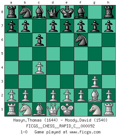 Last move : 1-0 2010 August 17 23:30:19 [Event "FICGS__CHESS__RAPID_C__000092"] [Site "FICGS"] [Date "2010.08.15"] [Round "1"] [White "Hasyn,Thomas"] [Black "Moody,David"] [Result "1-0"] [WhiteElo "1644"] [BlackElo "1540"] 1.c4 Nf6 2.g3 c6 3.Bg2 1-0 English, 1...Nf6 (Anglo-Indian defense) Player White won this chess game. Follow this game move after move (download)Chess is ruthless: you've got to be prepared to kill people. (Nigel Short) Es genügt nicht ein guter Spieler zu sein, man muß auch gut spielen. (Siegbert Tarrasch) El Ajedrez es parte de una cultura y si una cultura esta en decadencia, entonces también el Ajedrez declinará. (Mikhail Botvinnik) Vous m'avez demandé de vous exposer quel est le fondement de la prière. Je ne fais que préparer les pièces du jeu sur la table... Nous sera-t-il permis d'en adopter les règles et si nous les appliquons scrupuleusement nous ne tarderons pas à faire mat le Roi divin ! Il ne pourra échapper à nos mains. (Sainte Thérèse d'Avila, Chemin de perfection) Pushing plastic is for the many, pushing virtual pieces is for the fewer, pushing wood is for the very few. (Normajean Yates)