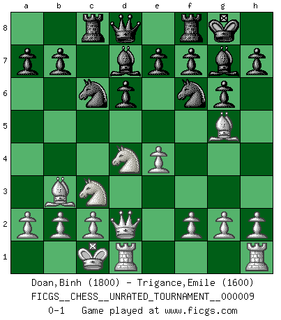 Last move : 0-1 2010 November 7 9:52:41 [Event "FICGS__CHESS__UNRATED_TOURNAMENT__000009"] [Site "FICGS"] [Date "2010.08.16"] [Round "1"] [White "Doan,Binh"] [Black "Trigance,Emile"] [Result "0-1"] [WhiteElo "1800"] [BlackElo "1600"] 1.e4 c5 2.Nf3 d6 3.d4 cxd4 4.Nxd4 Nf6 5.Nc3 g6 6.Bg5 Bg7 7.Bc4 Bd7 8.Bb3 Nc6 9.Qd2 O-O 10.O-O-O Rc8 0-1 This chess game has been lost on time (started : 2010.08.16 0:25:10) Sicilian : Dragon variation Kingside Castling by player Black (move 9) Queenside Castling by player White (move 10) Player Black won this chess game. Follow this game move after move (download)Chess is in its essence a game, in its form an art, and in its execution a science. (Baron Tassilo) Schon mancher Spieler hat aufgegeben, um zu vermeiden, daß er eine Figur verliert. (Savielly Grigorievitsch Tartakower) En el Ajedrez, tal como en la vida, las bendiciones de hoy pueden ser el veneno del mañana. (Assaic) 'L'échange des dames est un coup dur pour les deux adversaires...' Un journaliste lors d'une partie du match Spassky-Fischer May I never be complete. May I never be content. May I never be perfect. Deliver me, Tyler, from being perfect and complete. (Chuck Palahniuk, Fight Club)