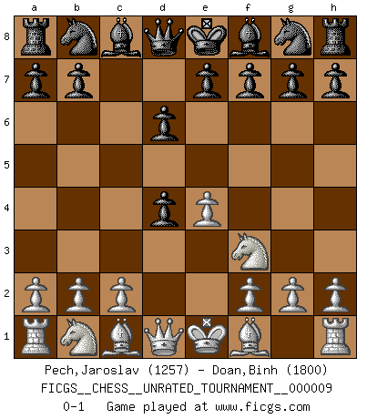 Last move : 0-1 2010 September 26 21:9:6 [Event "FICGS__CHESS__UNRATED_TOURNAMENT__000009"] [Site "FICGS"] [Date "2010.08.16"] [Round "1"] [White "Pech,Jaroslav"] [Black "Doan,Binh"] [Result "0-1"] [WhiteElo "1257"] [BlackElo "1800"] 1.e4 c5 2.Nf3 d6 3.d4 cxd4 0-1 Sicilian Player Black won this chess game. Follow this game move after move (download)A great player and a great example for many. His book My 60 Memorable Games had a big impact on me. It is a shame he didn't continue to enrich the world of chess with his unparalleled understanding after 1972. (Jan Timman, about Bobby Fischer's death) Warum muß ich gegen diesen IDIOTEN verlieren? (Aaron Nimzowitsch) Yo no creo en la psicología. Yo creo en las buenas movidas. (Bobby Fischer) J'ai toujours senti une vague pitié pour l'homme qui ne connaît rien aux échecs, tout comme j'en aurais pour un homme ignorant de l'amour. Les Echecs, comme la musique ou comme l'amour, ont le pouvoir de rendre heureux. (Siegbert Tarrasch) They say in chess you've got to kill the queen, and then you mate it... Oh I, do you ? (Red Hot Chili Peppers, Fortune faded)