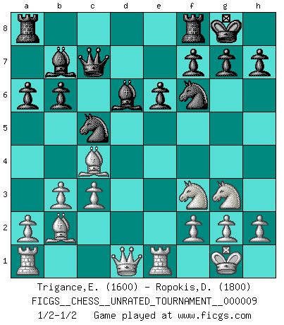 Last move : 1/2-1/2 2010 August 24 8:29:20 [Event "FICGS__CHESS__UNRATED_TOURNAMENT__000009"] [Site "FICGS"] [Date "2010.08.16"] [Round "1"] [White "Trigance,Emile"] [Black "Ropokis,Dimitrios"] [Result "1/2-1/2"] [WhiteElo "1600"] [BlackElo "1800"] 1.e4 c6 2.d4 d5 3.Nc3 dxe4 4.Nxe4 Nd7 5.Nf3 Ngf6 6.Ng3 e6 7.Bd3 Bd6 8.O-O O-O 9.Re1 Qc7 10.b3 b6 11.Bb2 Bb7 12.c3 c5 13.dxc5 Nxc5 14.Bc4 a6 1/2-1/2 Caro-Kann : Steinitz variation Kingside Castling by player White (move 8) Kingside Castling by player Black (move 8) This chess game ended in a draw. Follow this game move after move (download)Your body has to be in top condition. Your Chess deteriorates as your body does. You can't separate body from mind. (Bobby Fischer) Wenn du gegen Bobby spielst, ist es keine Frage von gewinnen oder verlieren. Es ist eine Frage des Überlebens. (Boris Vassilievich Spassky) Estaba muy claro de que el punto vulnerable del Gran Maestro Americano (Bobby Fischer) radicaba en las posiciones de doble filo, colgantes, irracionales, donde el siempre falló en encontrar un triunfo aún en una posición de clara victoria. (Efim Geller) Vous savez, camarade Pachman, je n'éprouve pas de plaisir à être ministre, je jouerais plutôt aux échecs comme vous, ou alors ferais une révolution au Venezuela. (Che Guevara à Ludek Pachman, 'Checkmate in Prague', 1975) The message for business people contemplating their place in the cyberspace is simple and direct: get linked or get lost. (Vic Sussman and Kenan Pollack)