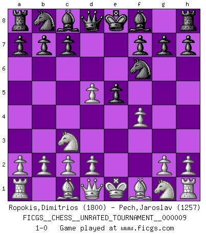 Last move : 1-0 2010 September 25 21:7:39 [Event "FICGS__CHESS__UNRATED_TOURNAMENT__000009"] [Site "FICGS"] [Date "2010.08.16"] [Round "1"] [White "Ropokis,Dimitrios"] [Black "Pech,Jaroslav"] [Result "1-0"] [WhiteElo "1800"] [BlackElo "1257"] 1.e4 Nf6 2.Nc3 e5 3.f4 d5 4.exd5 1-0 This chess game has been lost on time (started : 2010.08.16 0:25:10) Alekhine's defense Player White won this chess game. Follow this game move after move (download)I had a toothache during the first game. In the second game I had a headache. In the third game it was an attack of rheumatism. In the fourth game, I wasn't feeling well. And in the fifth game? Well, must one have to win every game ? (Siegbert Tarrasch) Im Fernschach kannst du während dem Spiel rauchen. (John Christen Knudsen) Aquel que teme a un Peón de Reina aislado, debería de retirarse del Ajedrez. (Siegbert Tarrasch) Des combinaisons [dans le jeu d'échecs] pareilles à des mélodies. Je crois entendre pour ainsi dire la musique des coups... (Vladimir Nabokov) Always be a first-rate version of yourself, instead of a second-rate version of somebody else. (Judy Garland)