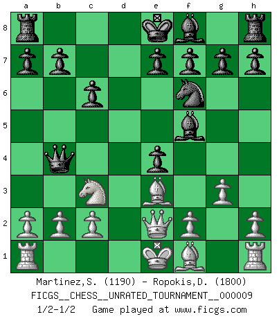 Last move : 1/2-1/2 2010 August 25 0:51:49 [Event "FICGS__CHESS__UNRATED_TOURNAMENT__000009"] [Site "FICGS"] [Date "2010.08.16"] [Round "1"] [White "Martinez,Silvio"] [Black "Ropokis,Dimitrios"] [Result "1/2-1/2"] [WhiteElo "1190"] [BlackElo "1800"] 1.e4 c6 2.Nf3 d5 3.d4 dxe4 4.Ne5 Nd7 5.Nxd7 Bxd7 6.Nc3 Nf6 7.Qe2 Bf5 8.g3 Qxd4 9.Be3 Qb4 1/2-1/2 Caro-Kann defense This chess game ended in a draw. Follow this game move after move (download)Robert Fischer is a law unto himself. (Larry Evans) Stil? Ich habe keinen Stil! (Anatoly Karpov) Si yo gano un torneo, yo lo gano por mí mismo. Yo hago las jugadas. Nadie me ayuda. (Bobby Fischer) Fischer est le meilleur joueur du monde et Karpov n'est qu'un joueur de bistrot. (Garry Kasparov, agé de 16 ans) Luck is when opportunity knocks and you answer. (Anonymous)