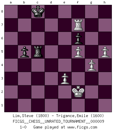 Last move : 1-0 2010 September 29 19:35:3 [Event "FICGS__CHESS__UNRATED_TOURNAMENT__000009"] [Site "FICGS"] [Date "2010.08.16"] [Round "1"] [White "Lim,Steve"] [Black "Trigance,Emile"] [Result "1-0"] [WhiteElo "1800"] [BlackElo "1600"] 1.d4 Nf6 2.c4 e6 3.Nc3 Bb4 4.e3 O-O 5.Nf3 d5 6.Bd2 b6 7.cxd5 exd5 8.Bd3 Bb7 9.O-O a6 10.Ne5 Nbd7 11.f4 Bxc3 12.Bxc3 Ne4 13.Bb4 c5 14.Bxe4 dxe4 15.Nxd7 Qxd7 16.dxc5 Qb5 17.c6 Qxb4 18.cxb7 Rad8 19.Qb3 Qxb3 20.axb3 Rd7 21.Rxa6 Rxb7 22.f5 f6 23.Rf4 Rd8 24.Rxe4 Rd2 25.Ra8+ Kf7 26.R4e8 Rxb2 27.Rg8 Rc7 28.Raf8+ Ke7 29.Rxg7+ Kxf8 30.Rxc7 Rxb3 31.Rxh7 Rc3 32.Kf2 b5 33.Rb7 Rc5 34.g4 Ke8 35.h4 Kd8 36.h5 Kc8 37.Rf7 1-0 Nimzo-Indian : 4.e3 e8g8, 5.Nf3 d7d5 Kingside Castling by player Black (move 4) Kingside Castling by player White (move 9) 10 pieces endgame at move 31 : White KRPPPP , Black KRPP WHITE : King + 1 Rook 4 Pawns BLACK : King + 1 Rook 2 Pawns Player White won this chess game. Follow this game move after move (download)No price is too great for the scalp of the enemy King. (Koblentz) Jeder weiß, dass Gasprom Putins persönliches Machtinstrument ist. Die Firma wird vom Kreml aus geleitet und wird schon deshalb nie transparent sein. (Garry Kasparov) Los finales de Peón son del Ajedrez lo que el cesped es del Golf. (Cecil Purdy) La vie est comme un jeu d'échecs : nous esquissons un plan, mais celui-ci est tributaire de ce que daignent faire l'adversaire aux échecs et le destin dans la vie. (Arthur Schopenhauer) The best weapon against an enemy is another enemy. (Friedrich Nietzsche)