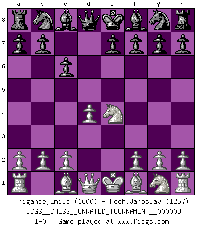 Last move : 1-0 2010 September 26 9:14:24 [Event "FICGS__CHESS__UNRATED_TOURNAMENT__000009"] [Site "FICGS"] [Date "2010.08.16"] [Round "1"] [White "Trigance,Emile"] [Black "Pech,Jaroslav"] [Result "1-0"] [WhiteElo "1600"] [BlackElo "1257"] 1.e4 c6 2.d4 d5 3.Nc3 dxe4 4.Nxe4 1-0 This chess game has been lost on time (started : 2010.08.16 0:25:10) Caro-Kann defense Player White won this chess game. Follow this game move after move (download)The passion for playing Chess is one of the most unaccountable in the world. (H.G. Wells) Vielleicht wirkt die Aura früherer Spieler glanzvoller als die der heutigen Spieler, aber das liegt daran, dass man kein Programm wie Fritz hatte, das einem all die Löcher in ihren Partien zeigt. (Vladimir Kramnik) Bobby es el jugador de Ajedrez mas fino que este país jamás haya producido. Su memoria para las movidas, su brillantez en soñar combinaciones y su feróz determinación por la victoria son algo extraño. (John Collins) Mais n'est-ce pas déjà le limiter injurieusement que d'appeler les échecs un jeu? N'est-ce pas aussi une science, un art, ou quelque chose qui, comme le cercueil de Mahomet entre ciel et terre, est suspendu entre l'un et l'autre, et qui réunit un nombre incroyable de contraires ? (Stefan Zweig) Methinks King Thibault should dub Marius Zubac a knight of the square board... I mean table, henceforth addressing him as Sir Marius, and bestow on him a suitable land from the kingdom of FICGS & marry him off to a worthy, fair maiden, lest he slice our heads with his mighty sword in his wrath. (Dinesh De Silva)