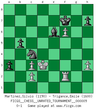 Last move : 0-1 2011 January 20 11:18:24 [Event "FICGS__CHESS__UNRATED_TOURNAMENT__000009"] [Site "FICGS"] [Date "2010.08.16"] [Round "1"] [White "Martinez,Silvio"] [Black "Trigance,Emile"] [Result "0-1"] [WhiteElo "1190"] [BlackElo "1600"] 1.e4 c5 2.Nf3 d6 3.Nc3 a6 4.Bc4 e6 5.O-O b5 6.Be2 Be7 7.d4 cxd4 8.Nxd4 Bb7 9.Bf4 e5 10.Nf5 exf4 11.Nxg7+ Kf8 12.Nf5 Qb6 13.Bg4 Nf6 14.Qf3 Nbd7 15.Qxf4 Nxg4 16.Qxg4 Rg8 17.Qh5 d5 18.exd5 Qg6 19.Qxg6 Rxg6 20.Rfe1 Bb4 21.Re3 Rc8 22.h3 Bxc3 23.bxc3 Bxd5 24.Nh4 Re6 25.Rd3 Nb6 26.a3 Bc4 27.Rf3 Rd8 28.Nf5 Kg8 29.Rg3+ Rg6 30.Ne7+ Kg7 31.Nxg6 fxg6 32.Re1 Rf8 33.Re7+ Rf7 34.Rxf7+ Kxf7 35.Rf3+ Ke7 36.g4 Bd5 37.Re3+ Kf7 38.f4 Be6 39.Rf3 Nc4 40.f5 gxf5 41.gxf5 Bc8 42.f6 Nxa3 43.Rf2 a5 44.Kg2 a4 45.Kf1 Nc4 46.Ke2 a3 47.Kd3 Be6 0-1 This chess game has been lost on time (started : 2010.08.16 0:25:10) Sicilian Kingside Castling by player White (move 5) Player Black won this chess game. Follow this game move after move (download)A man that will take back a move at Chess will pick a pocket. (Richard Fenton) Die Leute spielen gegen mich seit 15 Jahren unter Ihren Möglichkeiten. (Robert James Fischer) Si el ingenio solamente fuese necesario para lucirse, las mujeres serían las mejores jugadoras de Ajedrez del mundo. (Albin) Echiquier : carré parfait, comme la Jérusalem nouvelle décrite par l'auteur de l'Apocalypse, huit cases sur huit, exaltation du chiffre 4, symbole du cosmos aux quatre horizons... où le noir et le blanc, l'ombre et la lumière, le mal et le bien s'entremêlent et se conjuguent. (Robert Couffignal, Le Gambit du poète) CHESS, n. f. [echecs, Fr.] A nice and abstruse game, in which two sets of puppets are moved in opposition to each other. (Dr Samuel Johnson, A Dictionary Of The English Language, 1755)