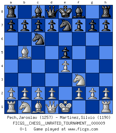 Last move : 0-1 2010 September 26 21:9:38 [Event "FICGS__CHESS__UNRATED_TOURNAMENT__000009"] [Site "FICGS"] [Date "2010.08.16"] [Round "1"] [White "Pech,Jaroslav"] [Black "Martinez,Silvio"] [Result "0-1"] [WhiteElo "1257"] [BlackElo "1190"] 1.e4 e5 2.Nf3 Nc6 3.Bb5 Nge7 0-1 Ruy Lopez : Cozio defense Player Black won this chess game. Follow this game move after move (download)We must make sure that Chess will not be like a dead language, very interesting, but for a very small group. (Sytze Faber) Modernes Schach erfordert enorme Anspannung. Es ist für einen normalen Menschen unmöglich das auszuhalten. (Viktor Kortschnoi) No volvere nunca a jugar contigo. Has insultado a mi amigo. - cuando un oponente se maldijo por una mala jugada (Miguel Najdorf) Les écrivains ont utilisé les échecs pour analyser les côtés extrêmes de la nature humaine. Dans ce cadre, les échecs offrent un champ d'expérimentation idéal. Mais on pourrait faire la même chose avec la peinture. Et là, en vous référant à Van Gogh, vous ne tirerez pas de conclusion définitive sur les peintres. (Gary Kasparov) It is not enough to be a good player... you must also play well. (Siegbert Tarrasch)