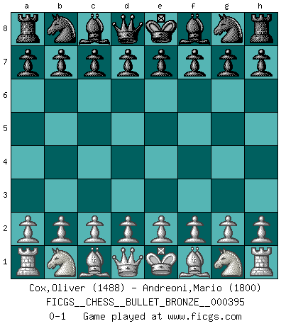 Last move : 0-1 2010 August 17 22:44:25 [Event "FICGS__CHESS__BULLET_BRONZE__000395"] [Site "FICGS"] [Date "2010.08.17"] [Round "1"] [White "Cox,Oliver"] [Black "Andreoni,Mario"] [Result "0-1"] [WhiteElo "1488"] [BlackElo "1800"] 0-1 This chess game has been lost on time (started : 2010.08.17 18:52:42) Player Black won this chess game. Follow this game move after move (download)Fischer is an American Chess tragedy on par with Morphy and Pillsbury. (Mig Greengard) Im Hotelzimmer gab es nur zwei Schaben. (Über die Turnierbedingungen) (Peter Swidler) Un buen jugador siempre tiene buena suerte. (José Raúl Capablanca) Il a essayé de se convaincre qu'il pourrait empêcher toutes les erreurs et ne jamais perdre. L'horreur ! Gary Kasparov au sujet de Robert Fischer. Wisdom is the reward you get for a lifetime of listening when you'd have preferred to talk. (Doug Larson)