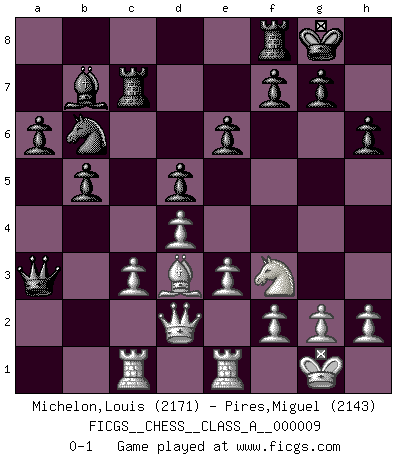 Last move : 0-1 2007 February 4 8:51:1 [Event "FICGS__CHESS__CLASS_A__000009"] [Site "FICGS"] [Date "2006.11.18"] [Round "1"] [White "Michelon,Louis"] [Black "Pires,Miguel"] [Result "0-1"] [WhiteElo "2171"] [BlackElo "2143"] 1.Nf3 Nf6 2.c4 c6 3.Nc3 d5 4.d4 e6 5.Bg5 Nbd7 6.e3 Be7 7.Qc2 O-O 8.Rd1 h6 9.Bh4 a6 10.a3 b5 11.cxd5 cxd5 12.Bd3 Bb7 13.O-O Rc8 14.Rc1 Nb6 15.Qe2 Ne4 16.Bxe7 Qxe7 17.Rfe1 Nxc3 18.bxc3 Qxa3 19.Qd2 Rc7 0-1 Reti Opening Kingside Castling by player Black (move 7) Kingside Castling by player White (move 13) Player Black won this chess game. Follow this game move after move (download)Weak points or holes in the opponent's position must be occupied by pieces not Pawns. (Siegbert Tarrasch) Zum Sieg gelangt man nicht, wenn man gut, sondern nur wenn man besser spielt (Savielly Grigorievitsch Tartakower) El Ajedrez, como cualquier otra actividad creativa, puede existir solo a través de méritos combinados de aquellos que tienen talento creativo y de aquellos que tienen la habilidad de organizar un trabajo creativo. (Mikhail Botvinnik) Le thème de l'attaque double intervient d'une manière ou d'une autre dans l'immense majorité des combinaisons. (Youri Averbakh) When you stop learning you start dying. (M. Scott Adams)