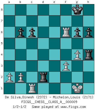 Last move : 1/2-1/2 2007 June 18 22:47:25 [Event "FICGS__CHESS__CLASS_A__000009"] [Site "FICGS"] [Date "2006.11.18"] [Round "1"] [White "De Silva,Dinesh"] [Black "Michelon,Louis"] [Result "1/2-1/2"] [WhiteElo "2372"] [BlackElo "2171"] 1.e4 c6 2.d4 d5 3.Nc3 dxe4 4.Nxe4 Nd7 5.Ng5 Nb6 6.N1f3 g6 7.Bd3 Bg7 8.O-O Nh6 9.c3 Nf5 10.Re1 O-O 11.h3 Nd6 12.Ne5 Bf5 13.Bf1 f6 14.Qb3+ Nd5 15.c4 Nxc4 16.Bxc4 fxe5 17.Qxb7 Qb6 18.Qxb6 axb6 19.dxe5 h6 20.Ne4 Rfd8 21.Bd2 Bxe5 22.Nc3 Bf6 23.g4 Bd3 24.Bxd3 Nxc3 25.Bxc3 Rxd3 26.Bxf6 exf6 27.Re6 Rxh3 28.Rxf6 Rh4 29.f3 Rd8 30.Rc1 Rd2 1/2-1/2 Caro-Kann : Steinitz variation Kingside Castling by player White (move 8) Kingside Castling by player Black (move 10) This chess game ended in a draw. Follow this game move after move (download)You know, comrade Pachman, I don't enjoy being a Minister, I would rather play Chess like you. (Che Guevara) Wie, soll nun auch die Opposition abgeschafft werden? Ja, es tut mir leid, Ihnen diesen Schmerz nicht ersparen zu können. (Aaron Nimzowitsch) No hay precio que sea tan grande por la cabellera del Rey enemigo. (Koblentz) Des idées, des idées, j'en ai cent, j'en ai mille. Des bonnes, des mauvaises, applicables, irréalisables... Il suffit de faire le tri ! (Roos) Dave, my mind is going. I can feel it. (HAL 9000 in 2001, a space odyssey)